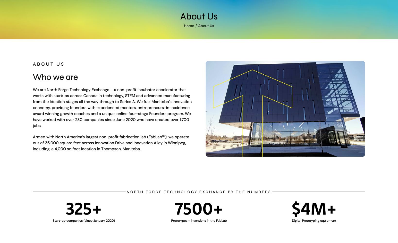 NorthForge is a Technology Incubator located in Manitoba, Canada. They have several programs designed to help startup, technology-based companies navigate the difficult world of going from Idea to Market Fit to Scale. North Forge works with over 325 startup companies and their founders at every stage of the startup lifecycle.